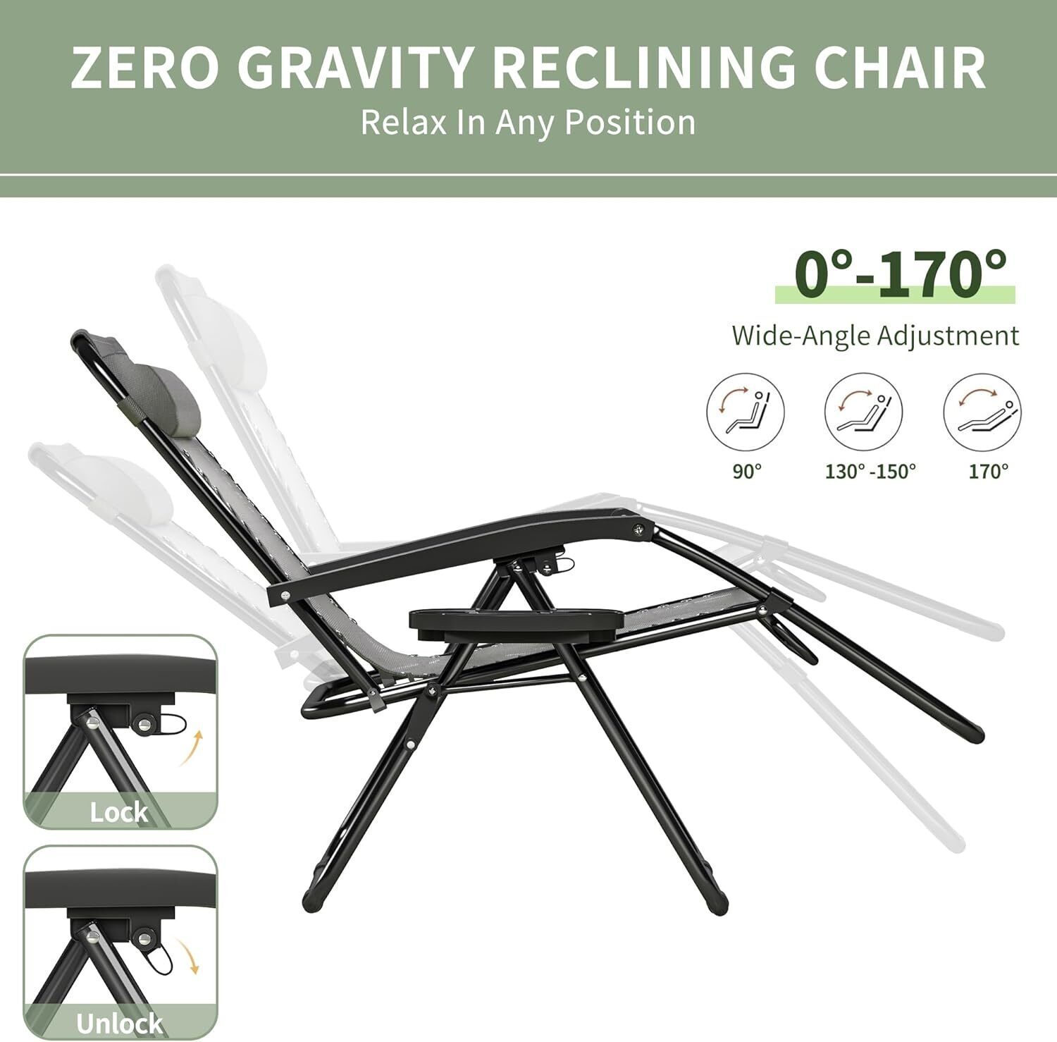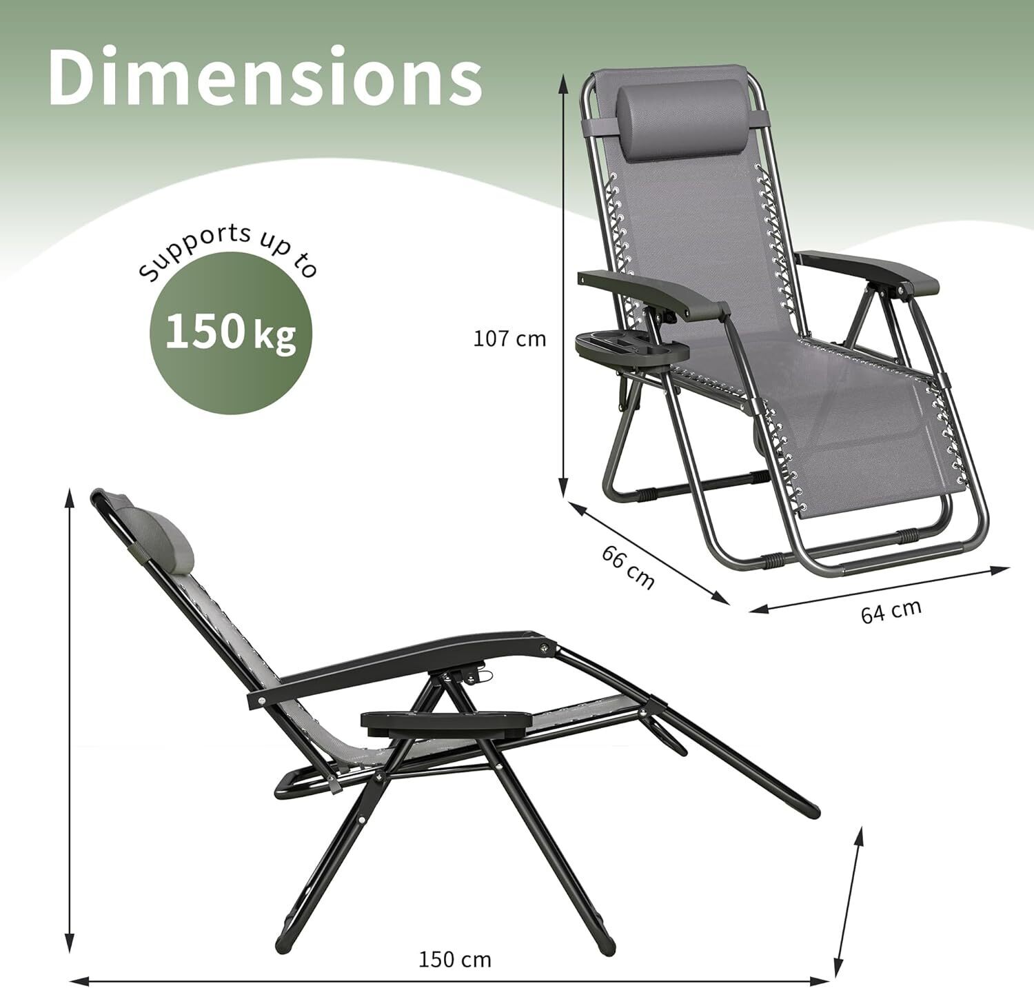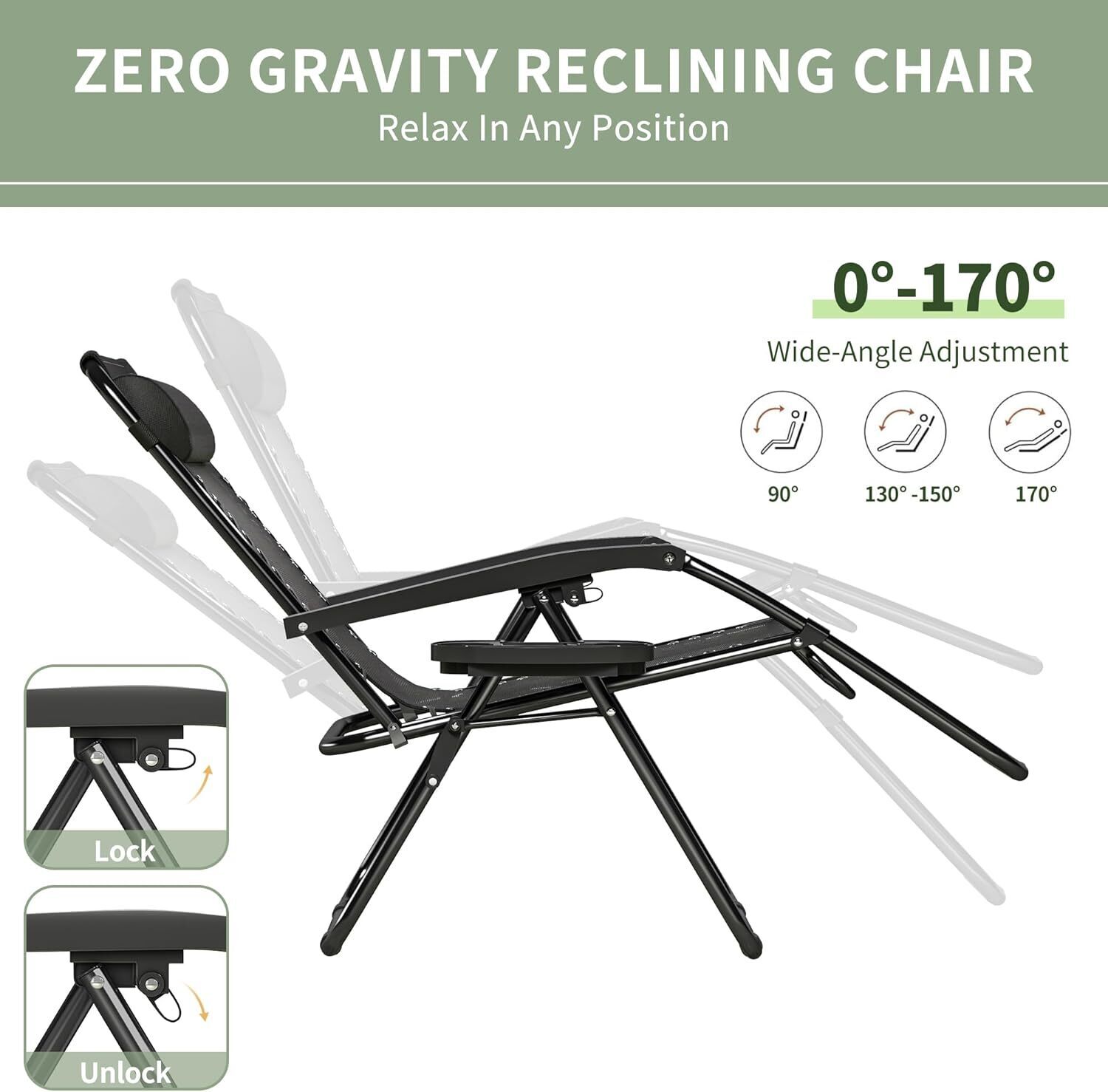 Enjoy full-body relaxation with these zero-gravity reclining chairs, designed to ease pressure and support a naturally balanced reclined posture. The backrest adjusts smoothly to deeper angles and locks securely into your preferred position, allowing comfortable transitions from upright sitting to fully relaxed lounging. The breathable fabric offers firm yet flexible support, while the foldable design makes the chairs easy to store, carry and use in a variety of outdoor spaces. Practical comfort details—such as an adjustable headrest, a detachable cup holder, non-slip feet and supportive armrests—enhance your outdoor leisure experience whether you're reading, sunbathing or simply unwinding.