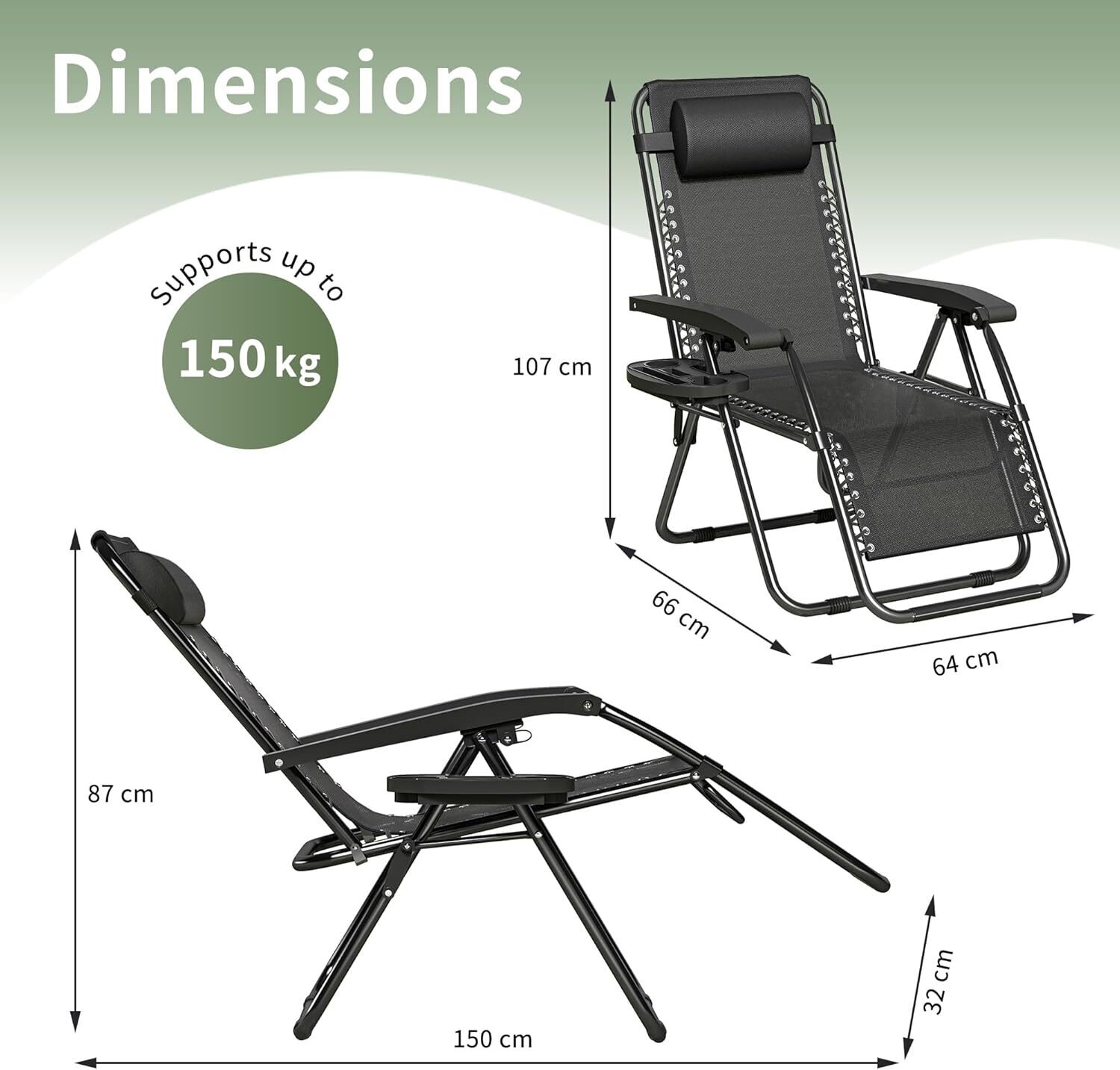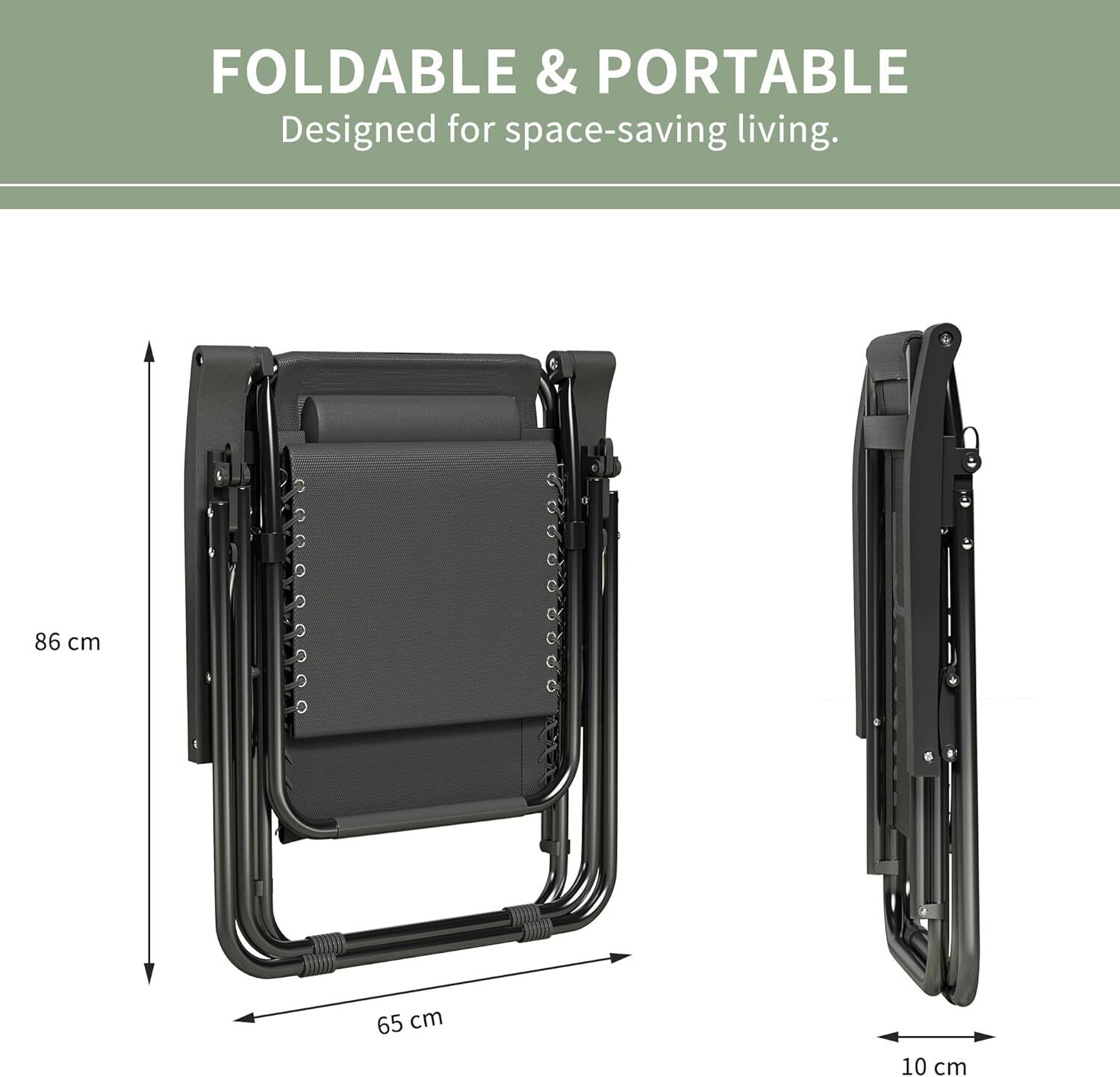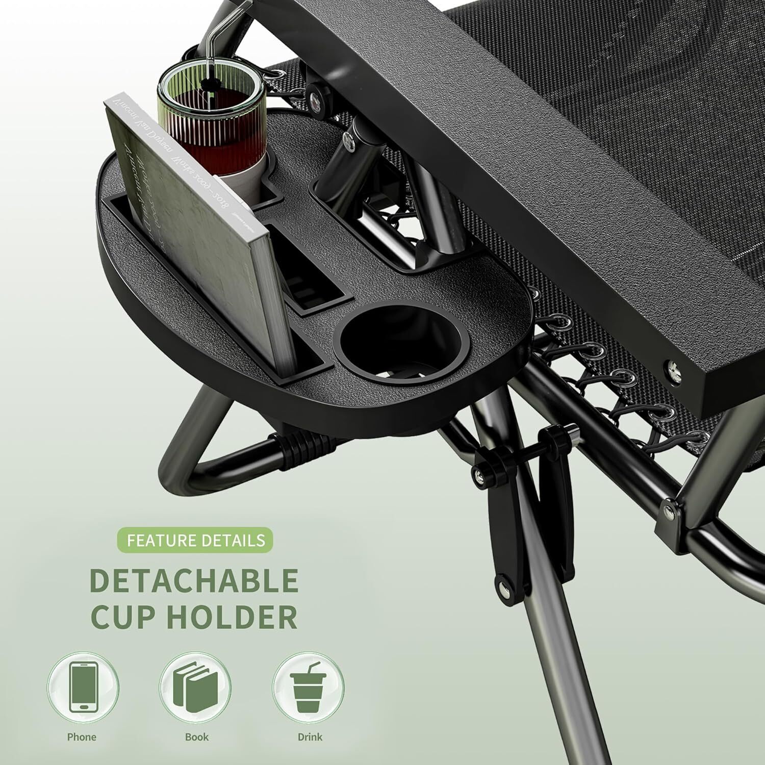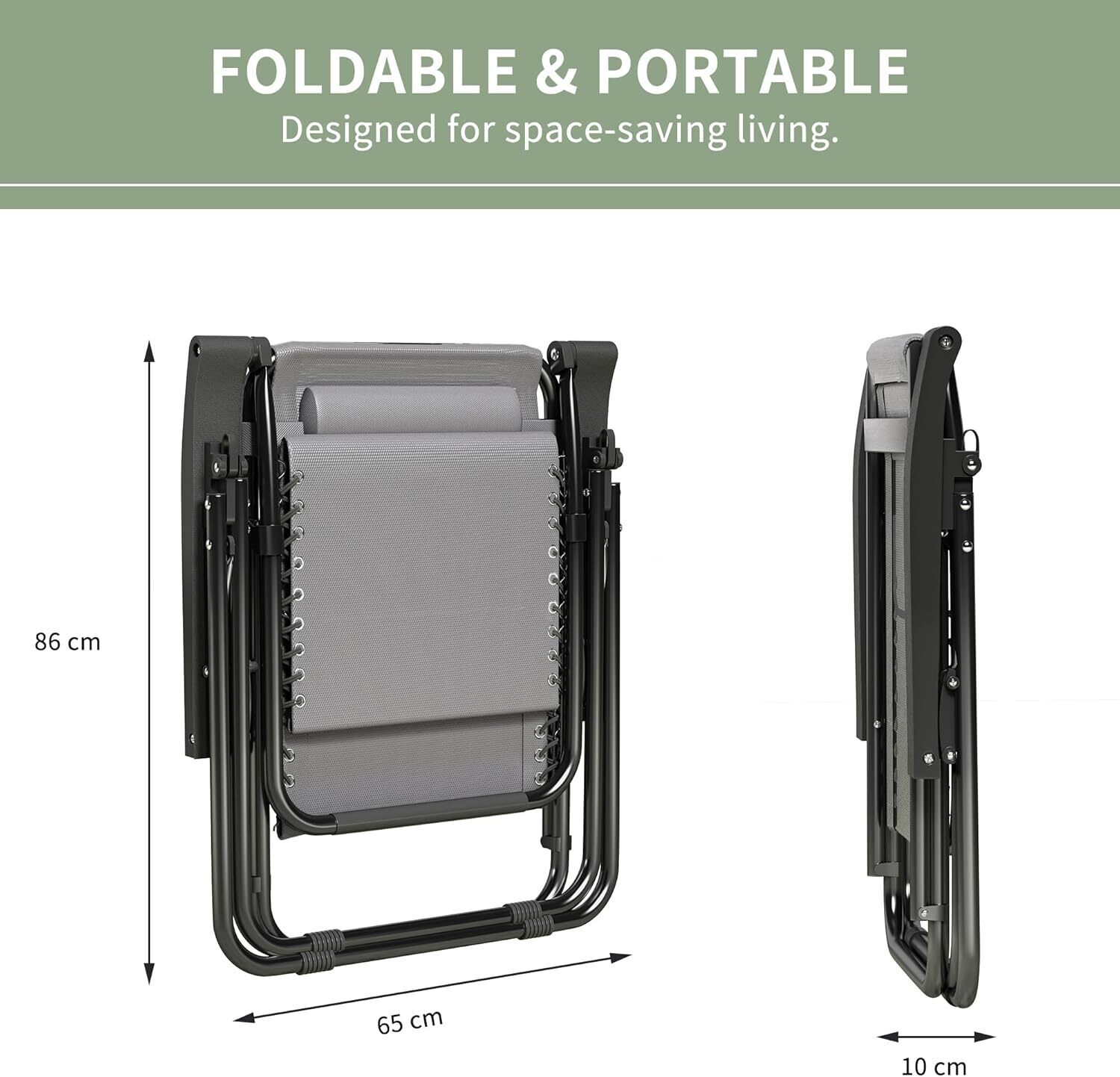Enjoy full-body relaxation with these zero-gravity reclining chairs, designed to ease pressure and support a naturally balanced reclined posture. The backrest adjusts smoothly to deeper angles and locks securely into your preferred position, allowing comfortable transitions from upright sitting to fully relaxed lounging. The breathable fabric offers firm yet flexible support, while the foldable design makes the chairs easy to store, carry and use in a variety of outdoor spaces. Practical comfort details—such as an adjustable headrest, a detachable cup holder, non-slip feet and supportive armrests—enhance your outdoor leisure experience whether you're reading, sunbathing or simply unwinding.